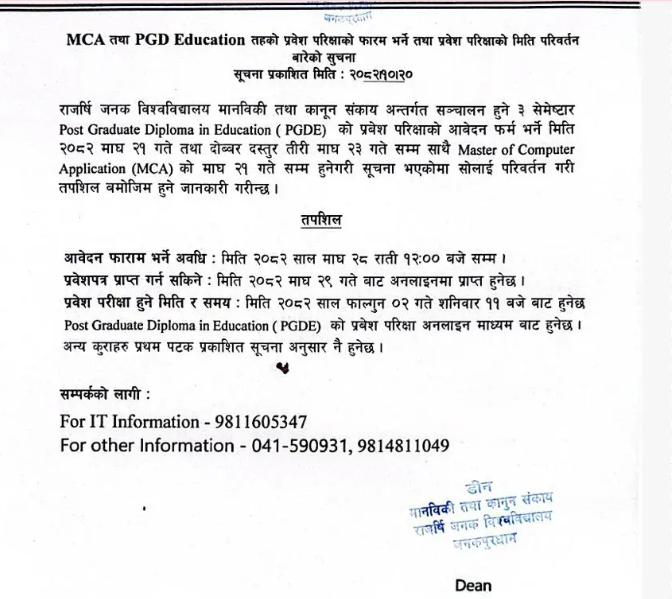 Rajarshi Janak University, Faculty of Humanities and Law, has extended the deadline for submitting the application form for admissions to its Master of Computer Application (MCA) program for the academic year 2082/83.