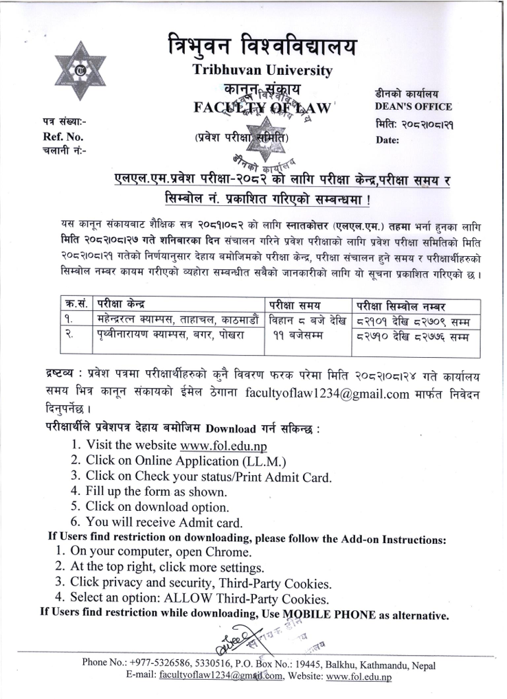 Tribhuvan University, Faculty of Law, has published the examination schedule, including exam center, time, and symbol number for the upcoming LLM Entrance Exam for admission in the academic year 2081/2082. The LLM entrance examination is set to take place on Saturday, Mangsir 27, 2082. Candidates are assigned to one of two centres based on their symbol number: