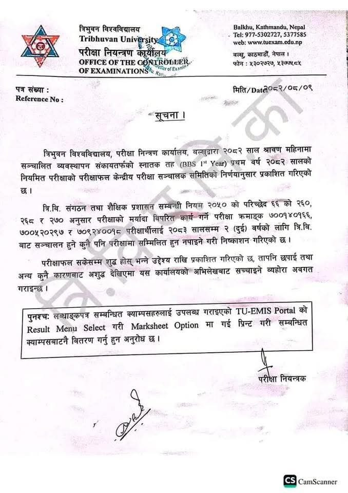 Tribhuvan University Office of the Controller of Examination, Balkhu, has published the results of the 4-year Bachelor of Business Studies (BBS) first year (Regular) 2082. The examination of the 4-year BBS first year (Regular) 2082 was held in the month of Shrawan 2082.