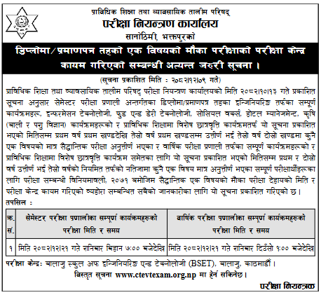 Council for Technical Education and Vocational Training (CTEVT), Examination Controller Office, Sanothimi, Bhaktapur has published the examination form fill-up notice for the diploma level semester system one subject chance exam. This notice has been published for students studying in CTEVT’s constituent, partnership, community schools, and privately run institutions under the semester examination system for all programs in Engineering, Information Technology, Food and Dairy Technology, Social Work, Hotel Management, and Agriculture (Plant and Animal Science).