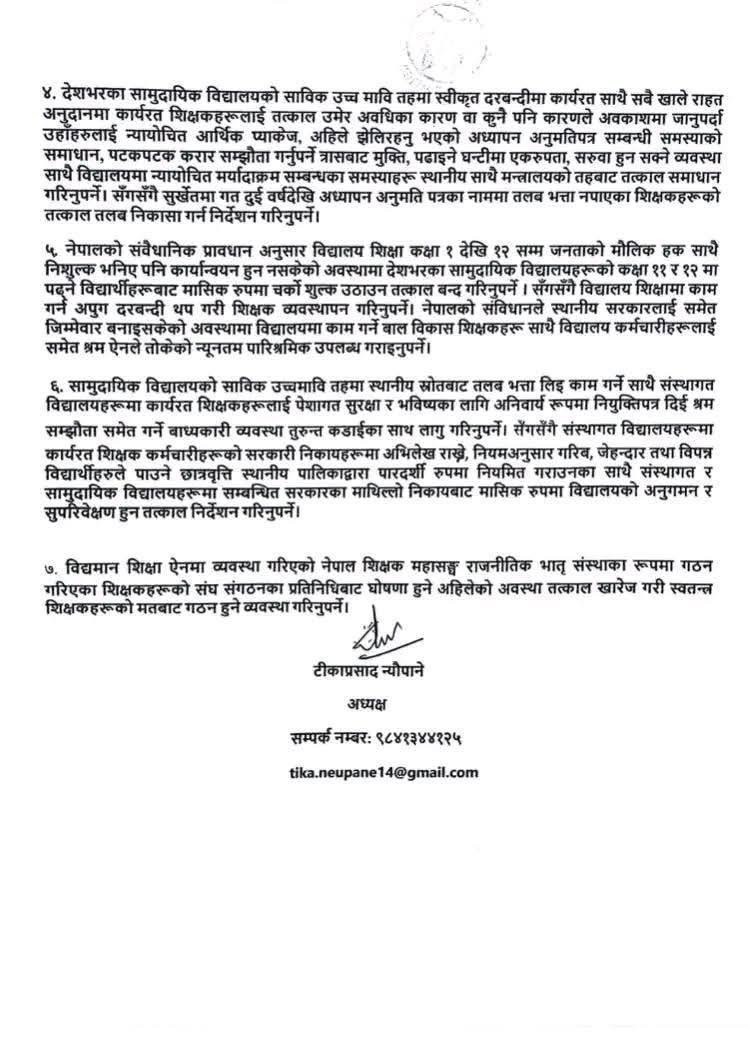 The union urges the government to enroll temporary and relief teachers in the Social Security Fund as announced in the national budget for FY 2082/83. It also calls for immediate implementation of previously agreed provisions, including remote area allowances, medical support, and accumulated sick leave. - Fair Treatment and Professional Stability