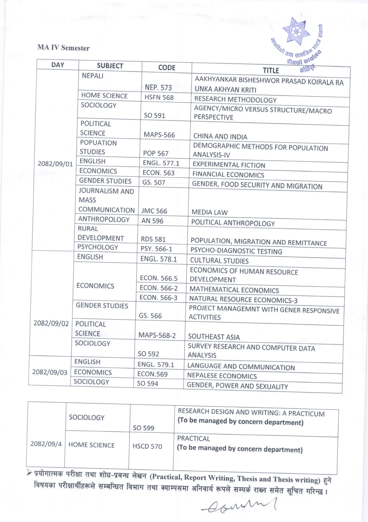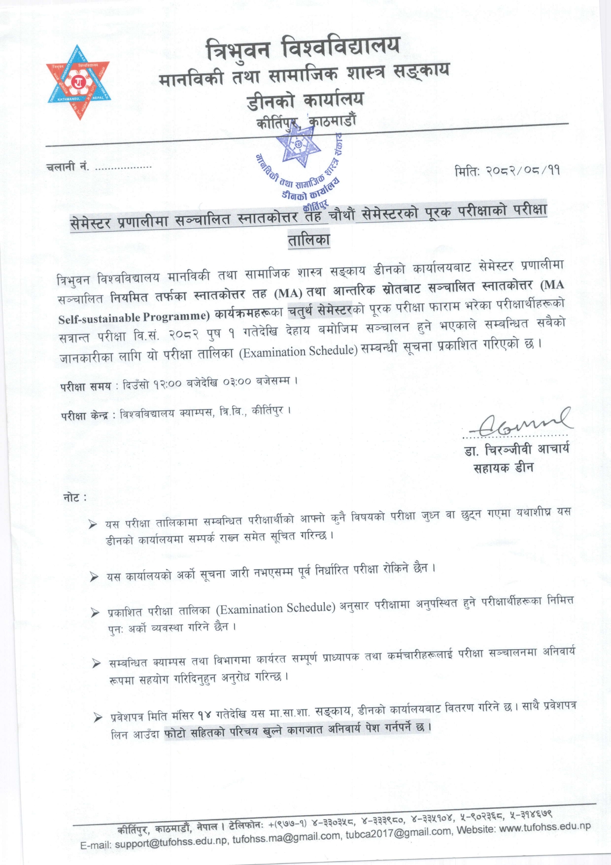 The Office of the Dean, Faculty of Humanities and Social Sciences, Tribhuvan University, has announced the supplementary examination schedule for the fourth semester of the Master’s (MA) programs conducted under the semester system. This notice applies to students of both the regular MA programs and the MA Self-sustainable Program who have submitted the supplementary examination form.