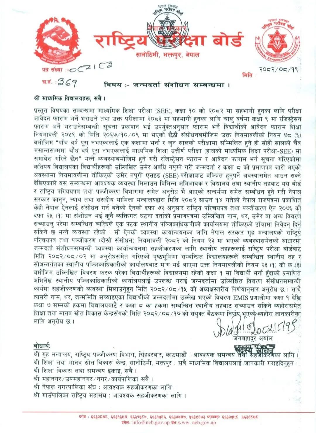 In a significant relief for students, the National Examinations Board (NEB) has issued a notice confirming the legal path for students to correct discrepancies in their birth certificate details ( date, name, age, and surname), allowing them to meet the minimum age requirement for the Secondary Education Examination (SEE).