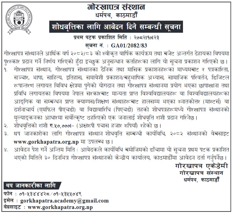 This research fellowship (award) will be awarded to the person whose research paper/thesis is judged the best by Gorkhapatra Sansthan's evaluation. Eligible papers include those already completed at the Master's, M.Phil., or Ph.D. level from government-recognized universities or their affiliated campuses. The research topics should cover contributions made through Gorkhapatra Sansthan's daily and monthly publications in journalism, communication, language, literature, history, inclusive publishing/multilingual practice, social change, digital transformation, or topics related to the printing press and technology used at Gorkhapatra Sansthan.