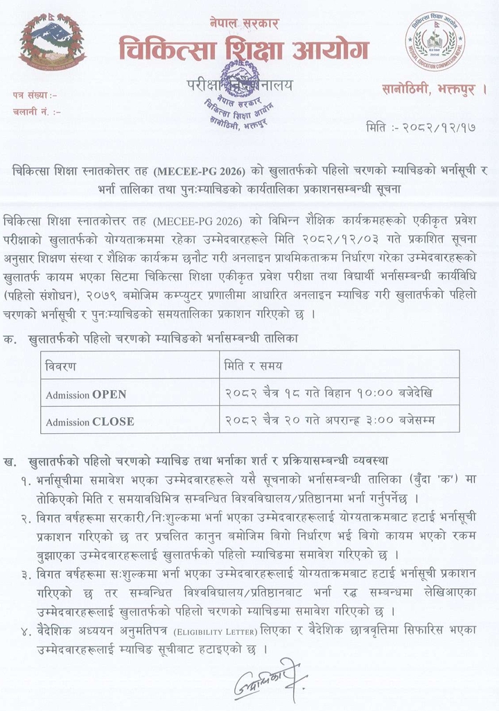- Admission of candidates will be canceled, even during the study period, if they are found to have submitted false information, have been recommended for foreign study, have not fulfilled the service obligation as per Section 38(1) of the National Medical Education Act, 2075, or were previously admitted under government/free quotas.