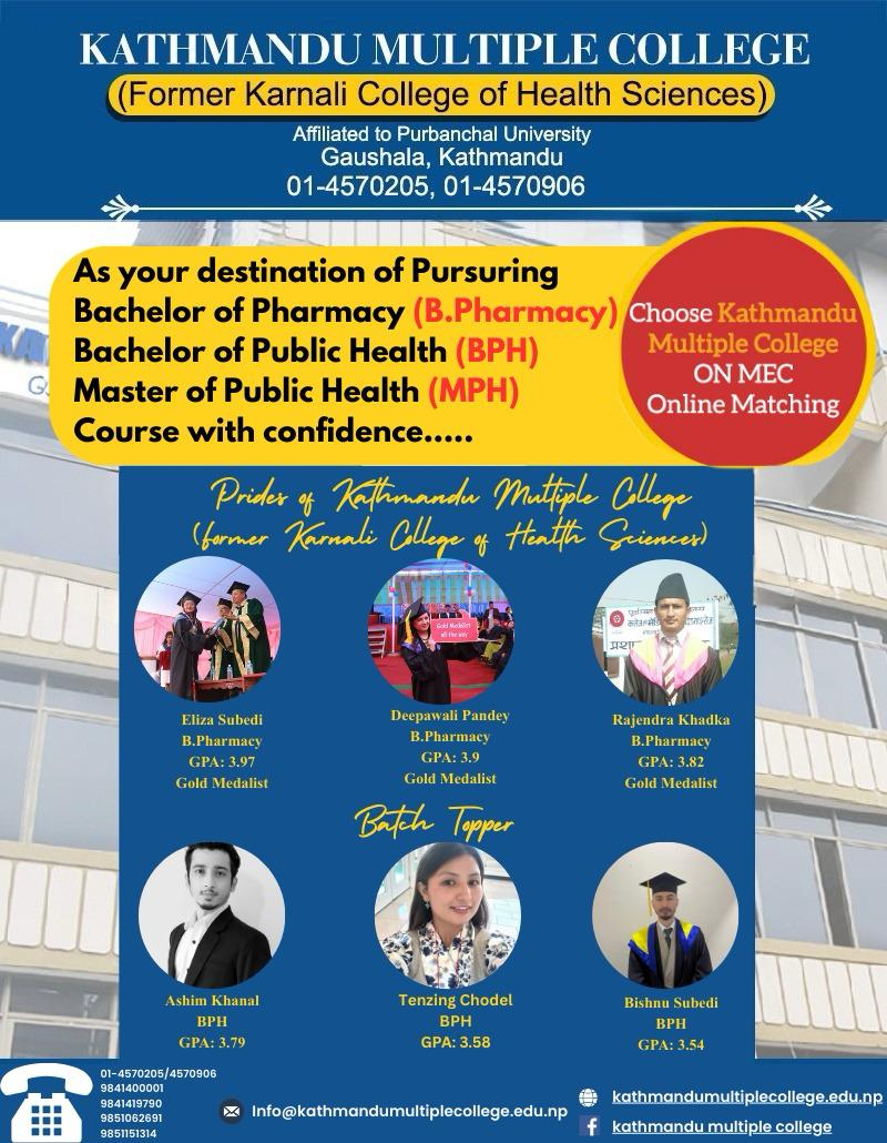 Kathmandu Multiple College, located in Gaushala, Kathmandu, has introduced a special scholarship package aimed at students aspiring to pursue Bachelor of Public Health (BPH) or Bachelor of Pharmacy (BPharm) after passing the Medical Education Commission’s Bachelor-level Common Entrance Examination (CEE).