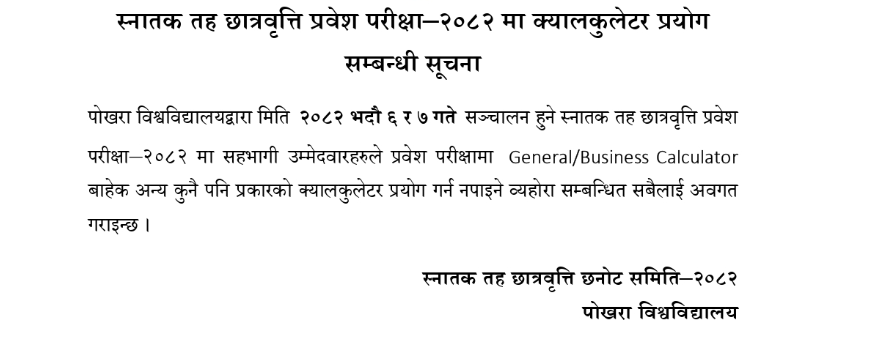 As per the official notice of Pokhara University, candidates appearing in the Bachelor-level scholarship examination are allowed to use General/Business calculators, but not any advanced calculators.