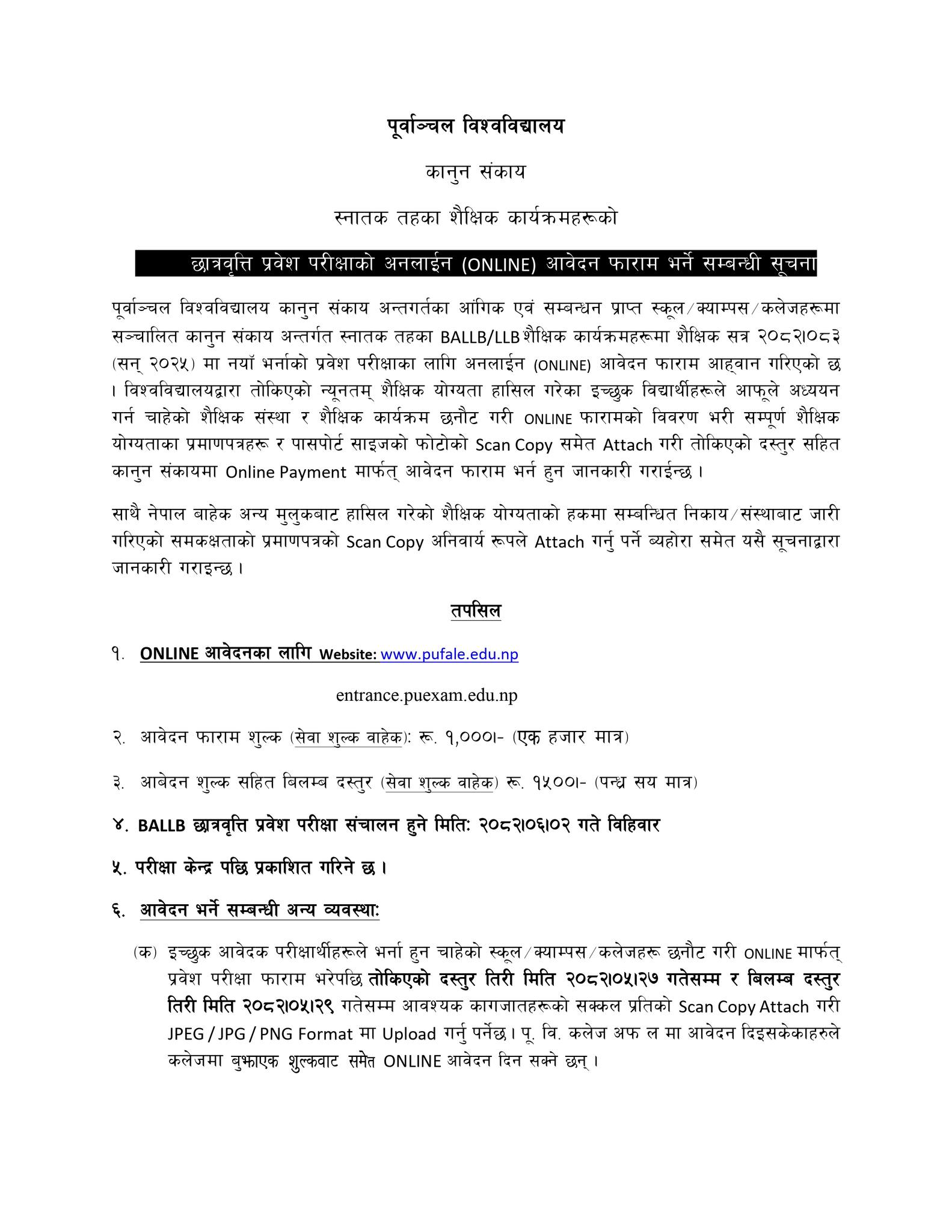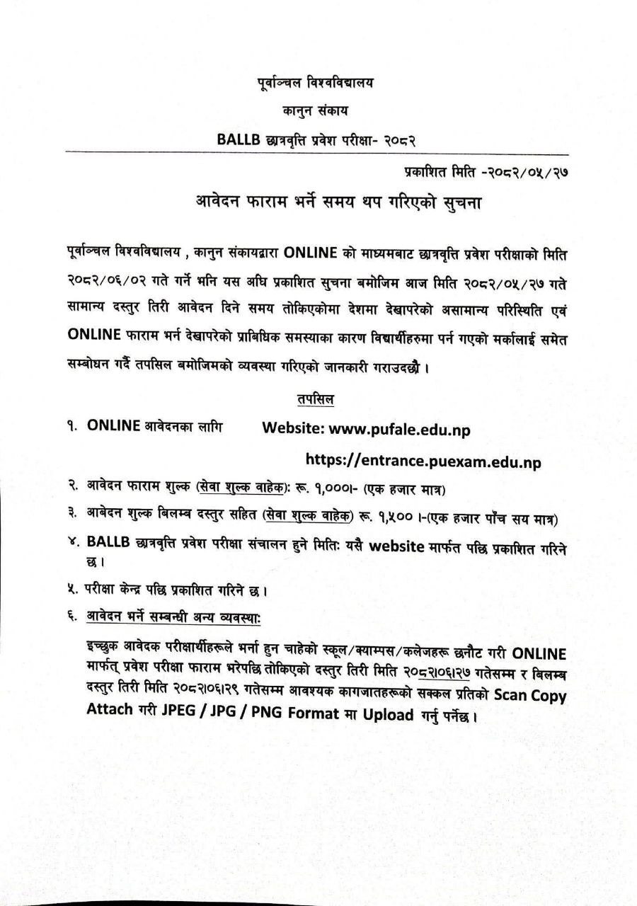 Purbanchal University, Faculty of Law, Biratnagar, has published the scholarship entrance exam notice for Bachelor of Arts, Bachelor of Laws (BALLB) programs for the academic year 2082/83. According to Purbanchal University's scholarship and scholarship entrance examination procedure for 2082, the scholarship application form is now open for needy and deserving students pursuing BALLB.