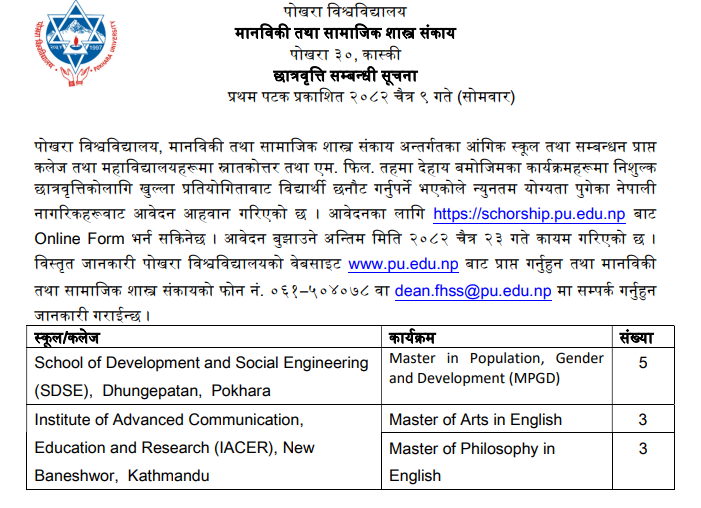 Pokhara University, Faculty of Humanities and Social Sciences, invites applications from eligible Nepali citizens for free scholarships to study Master's in Population, Gender and Development, Master's of Arts in English and MPhil in English at its constituent schools and affiliated colleges.
