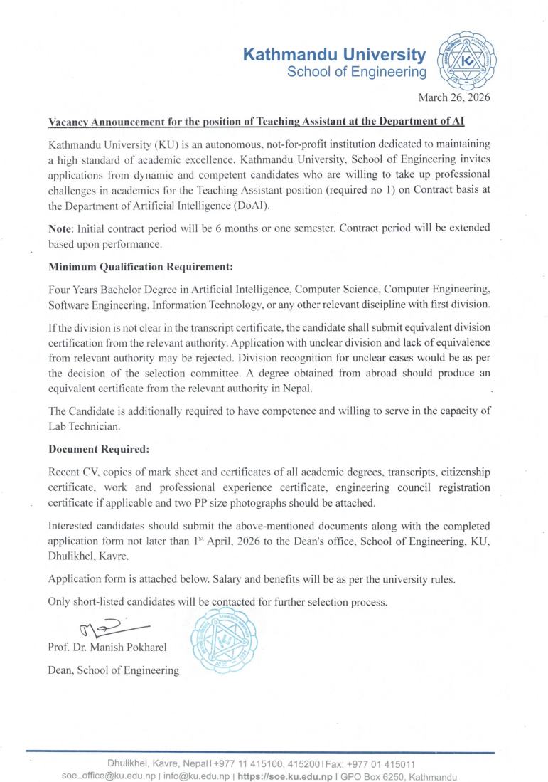 Kathmandu University, School of Engineering invites applications from dynamic and competent candidates who are willing to take up professional challenges in academics for the Teaching Assistant position (required no 1) on Contract basis at the Department of Artificial Intelligence (DoAI).