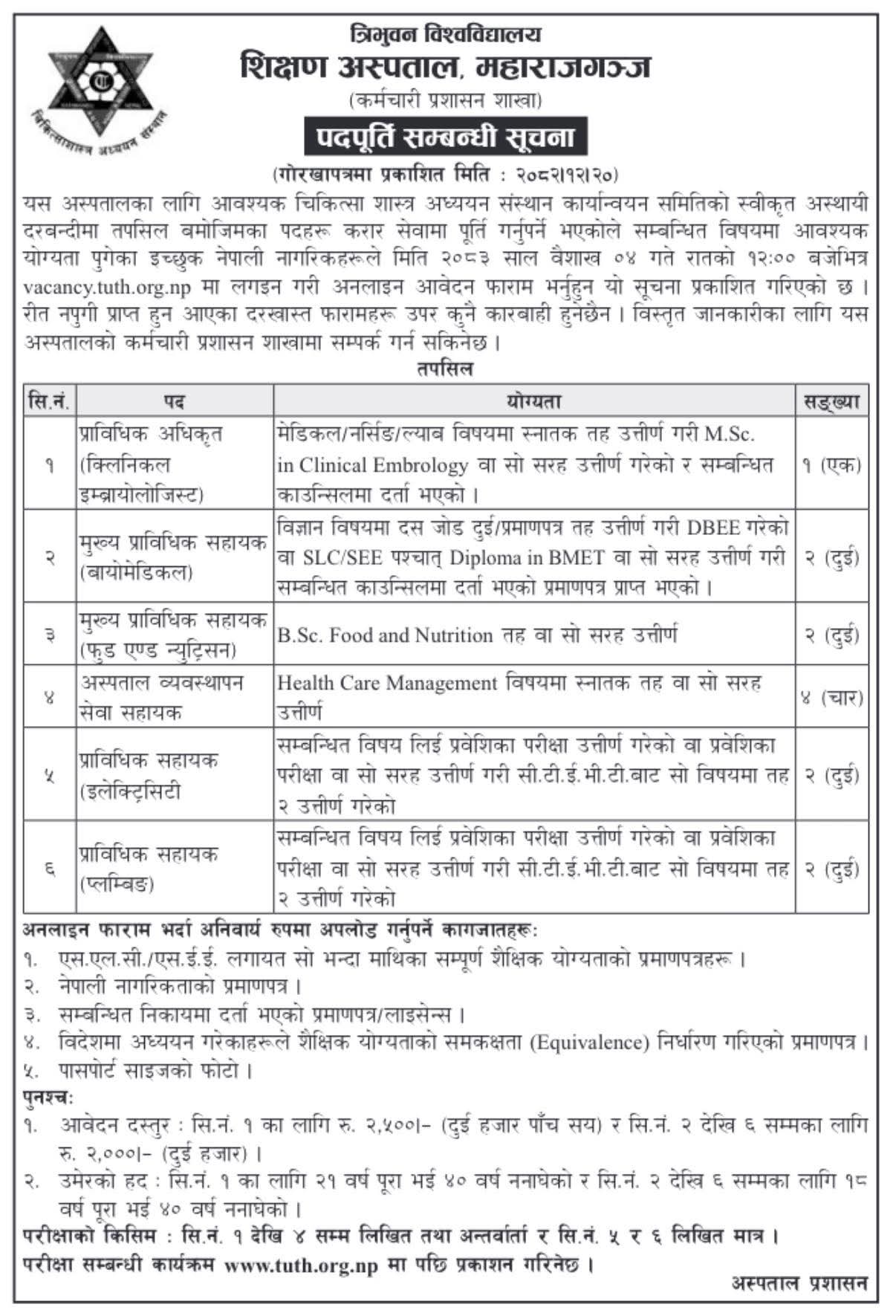 Tribhuvan University Teaching Hospital (TUTH), Maharajgunj, has invited applications from qualified Nepali citizens for various technical and administrative positions on a contract service basis.