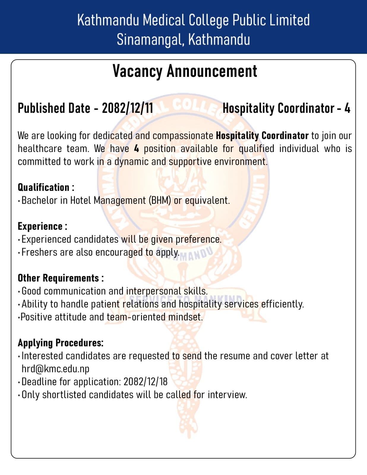 Kathmandu Medical College Public Limited invites applications from qualified Nepali Citizens for the position of Hospitality Coordinator to join its healthcare team at Duwakot, Bhaktapur. The college is seeking dedicated and compassionate individuals to join its healthcare team in a dynamic and supportive environment.