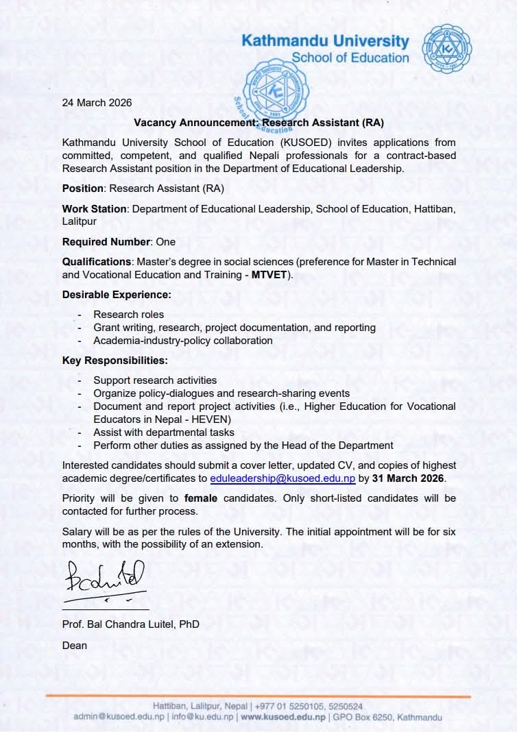 Kathmandu University School of Education (KUSOED) invites applications from committed, competent, and qualified Nepali professionals for a contract-based Research Assistant position in the Department of Educational Leadership.